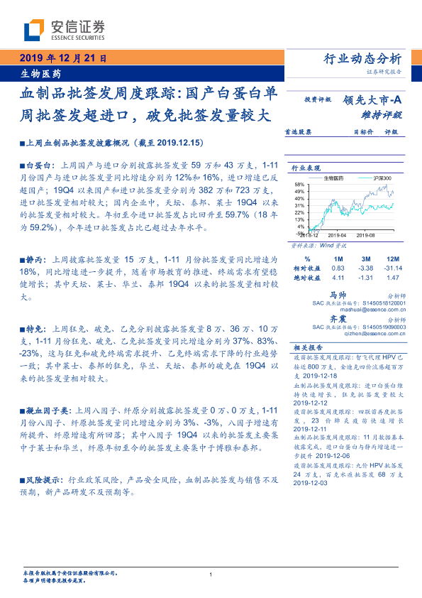 【安信证券】【20191221】血制品批签发周度跟踪:国产白蛋白单周批签发超进口,破免批签发量较大-12页