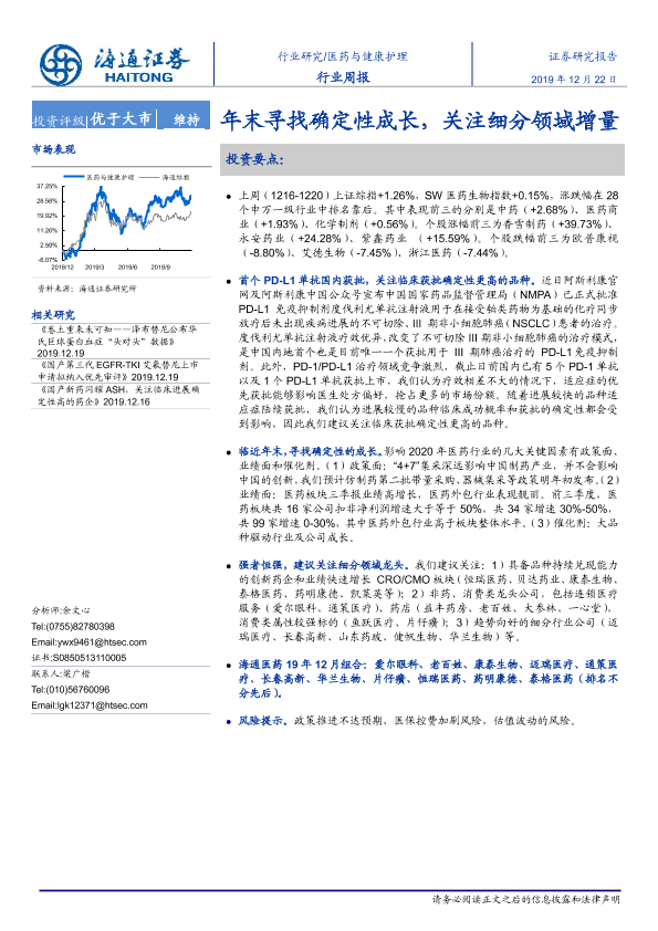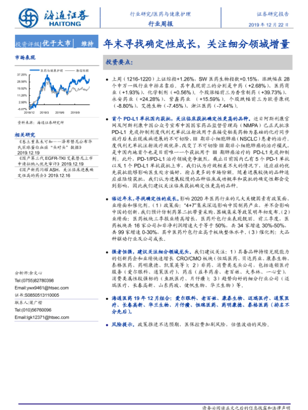 【海通证券】【20191222】医药与健康护理行业周报:年末寻找确定性成长,关注细分领域增量-5页