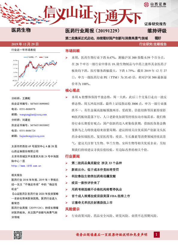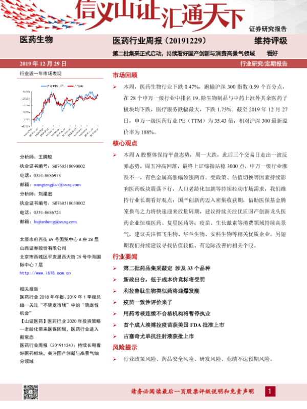 【山西证券】【20191229】医药行业周报:第二批集采正式启动,持续看好国产创新与消费高景气领域-8页