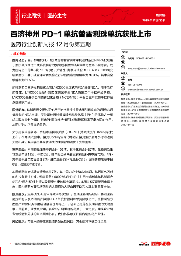 【西部证券】【20191230】医药行业创新周报12月份第五期:百济神州PD-1单抗替雷利珠单抗获批上市-10页