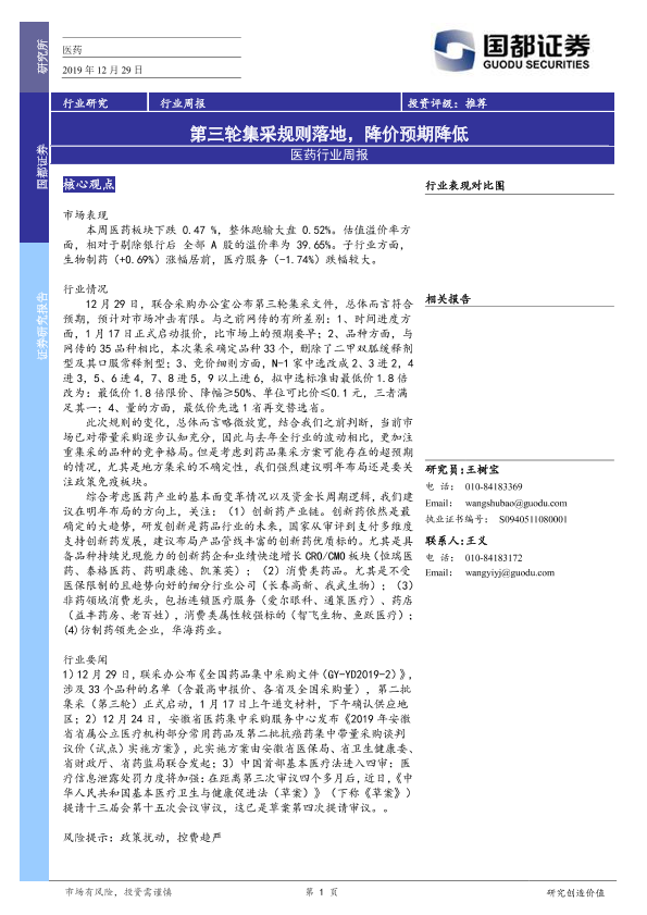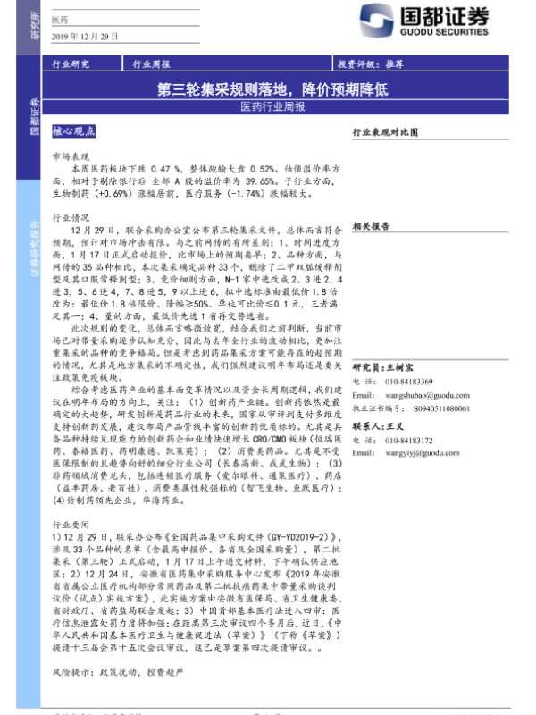 【国都证券】【20191229】医药行业周报:第三轮集采规则落地,降价预期降低-3页