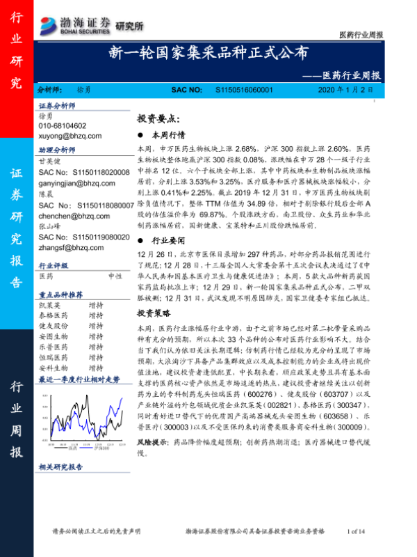 【渤海证券】【20200102】医药行业周报:新一轮国家集采品种正式公布-14页