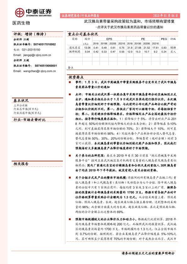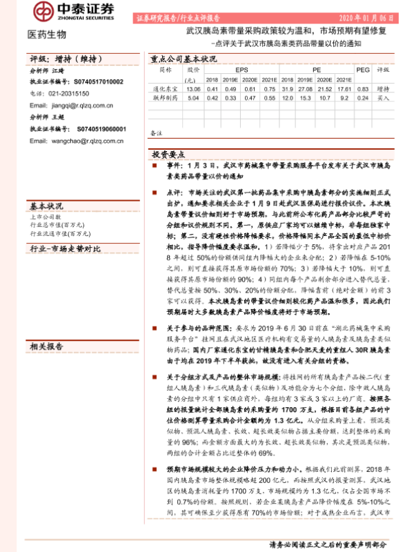 【中泰证券】【20200106】点评关于武汉市胰岛素类药品带量以价的通知:武汉胰岛素带量采购政策较为温和,市场预期有望修复-5页