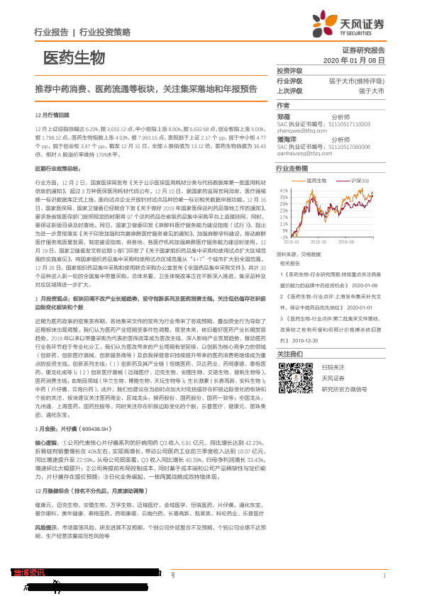 【天风证券】【20200108】医药生物行业投资策略:推荐中药消费、医药流通等板块,关注集采落地和年报预告-14页