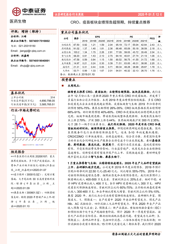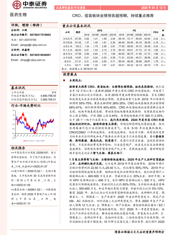 【中泰证券】【20200112】医药生物行业周报:CRO、疫苗板块业绩预告超预期,持续重点推荐-8页