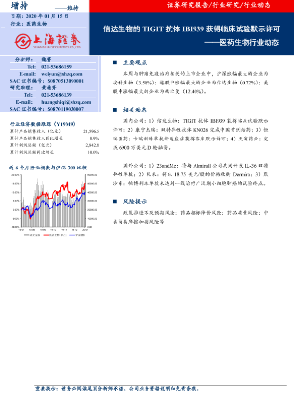 【上海证券】【20200115】信达生物的TIGIT抗体IBI939获得临床试验默示许可-8页
