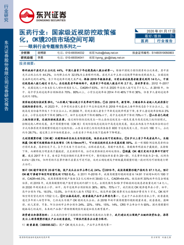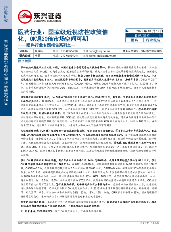 【东兴证券】【20200117】医药行业:国家级近视防控政策催化,OK镜20倍市场空间可期-22页