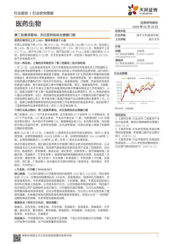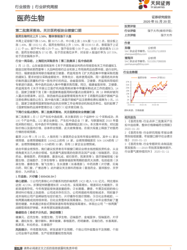 【天风证券】【20200120】医药生物行业研究周报:第二批集采落地,关注医药板块业绩窗口期-24页