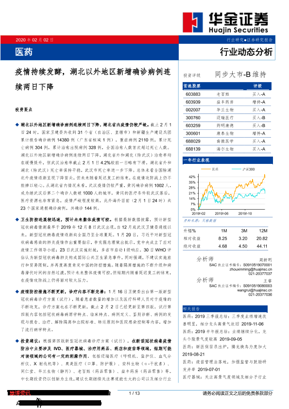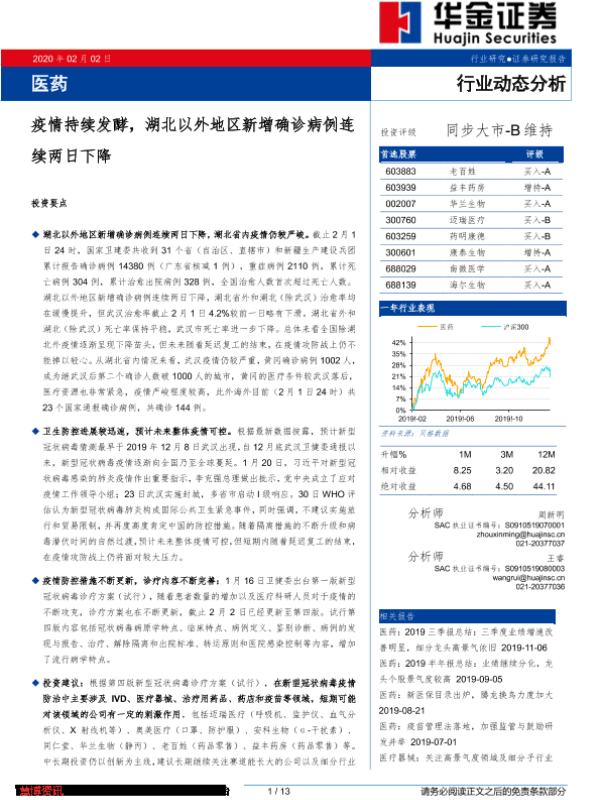 【华金证券】【20200202】医药行业动态分析:疫情持续发酵,湖北以外地区新增确诊病例连续两日下降-13页