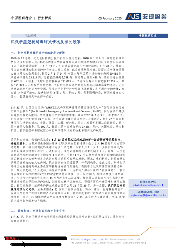 【安捷证券】【20200205】中国医药行业:武汉新型冠状病毒肺炎情况及相关股票-5页