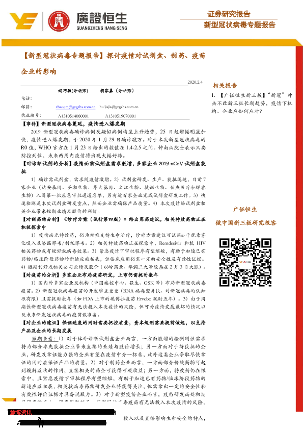 【广证恒生】【20200204】医药行业【新型冠状病毒专题报告】探讨疫情对试剂盒、制药、疫苗企业的影响-18页