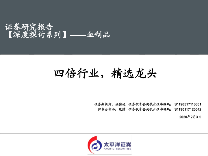 【太平洋证券】【20200203】深度探讨系列——血制品:四倍行业,精选龙头-53页