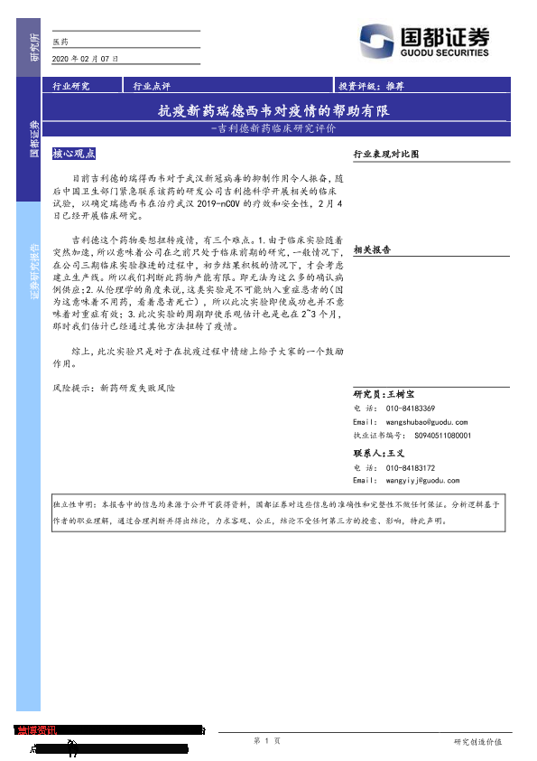 【国都证券】【20200207】吉利德新药临床研究评价:抗疫新药瑞德西韦对疫情的帮助有限-2页