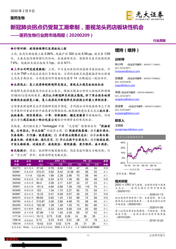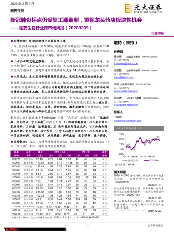 【光大证券】【20200209】医药生物行业跨市场周报:新冠肺炎拐点仍受复工潮牵制,重视龙头药店板块性机会-32页
