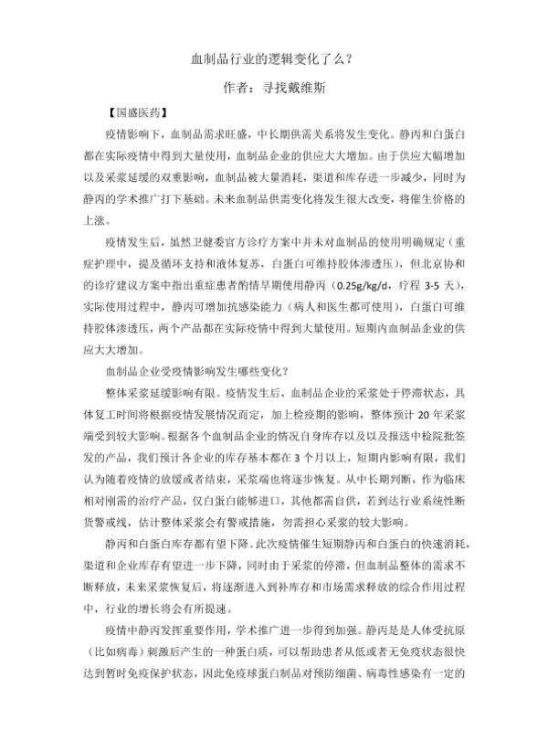 【国盛证券】【20200214】血制品行业的逻辑变化了么?-2页