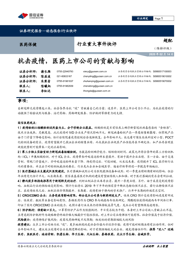 【国信证券】【20200214】抗击疫情,医药上市公司的贡献与影响-16页