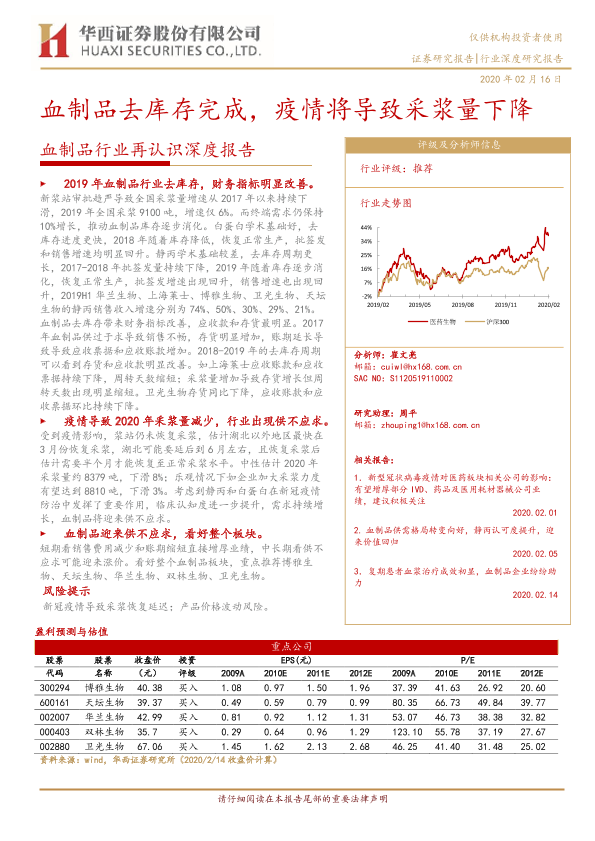 【华西证券】【20200216】血制品行业再认识深度报告:血制品去库存完成,疫情将导致采浆量下降-10页