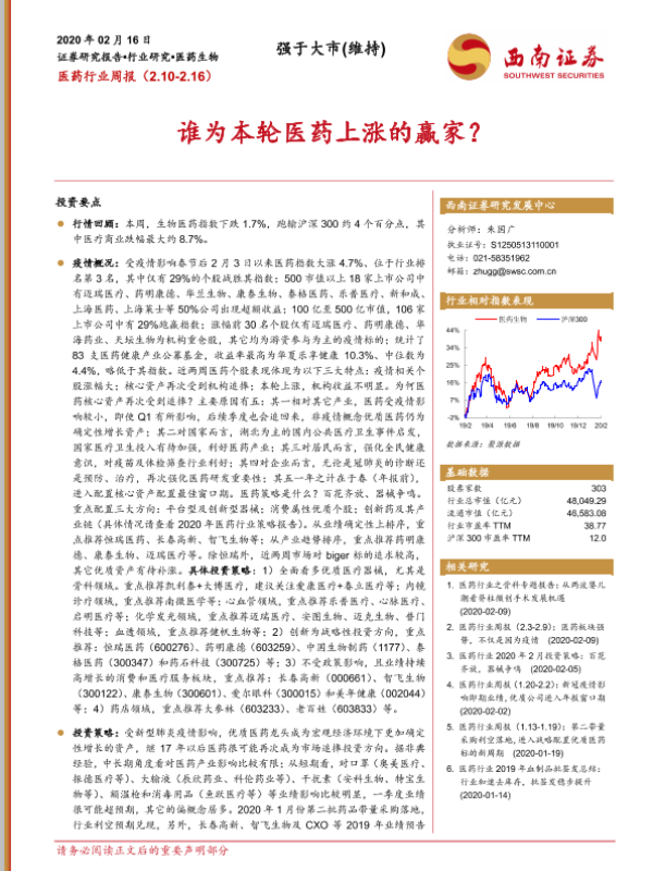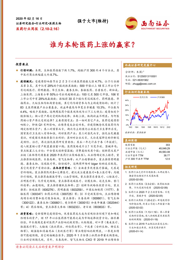 【西南证券】【20200216】医药行业周报:谁为本轮医药上涨的赢家?-17页