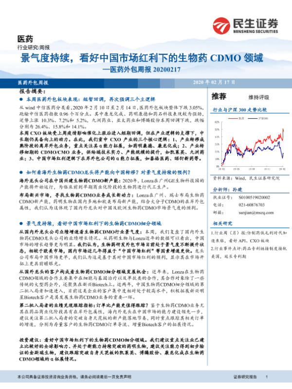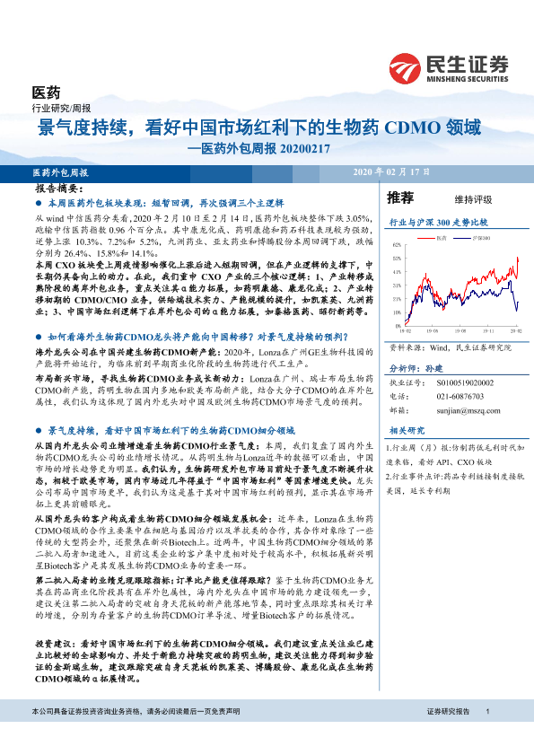 【民生证券】【20200217】医药外包周报:景气度持续,看好中国市场红利下的生物药CDMO领域-21页