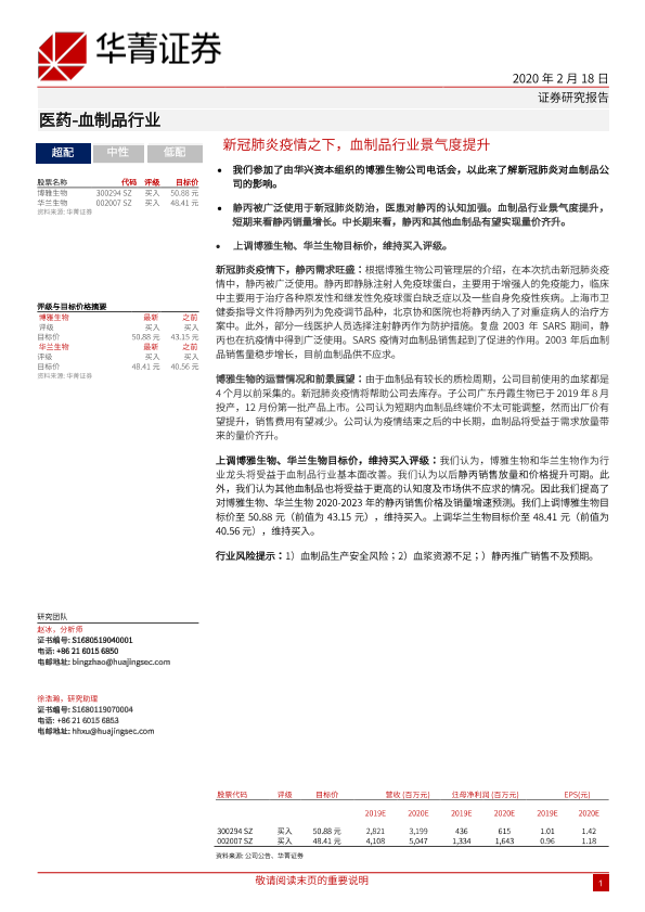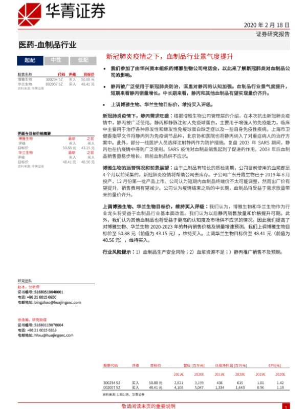 【华兴证券】【20200218】新冠肺炎疫情之下,血制品行业景气度提升-7页