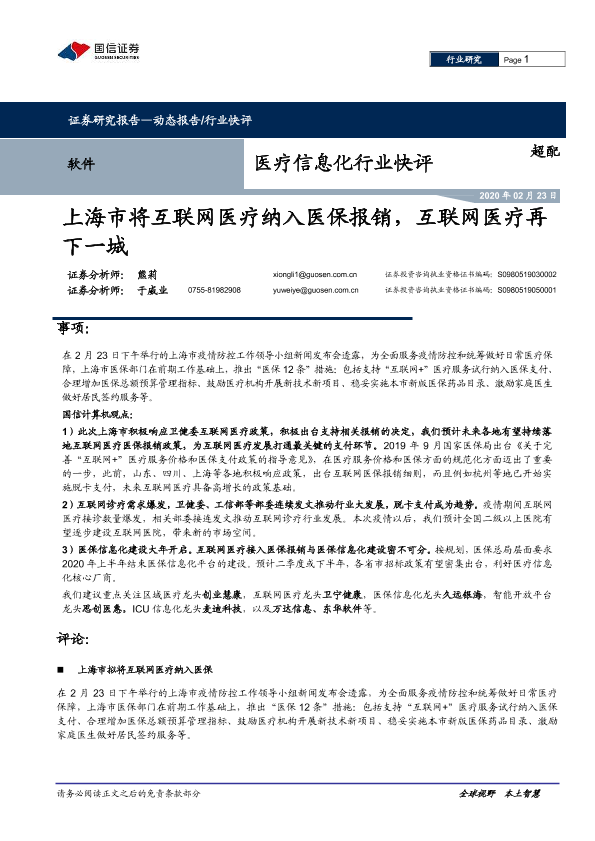 【国信证券】【20200223】医疗信息化行业快评:上海市将互联网医疗纳入医保报销,互联网医疗再下一城-7页