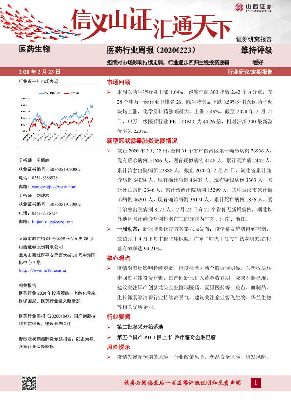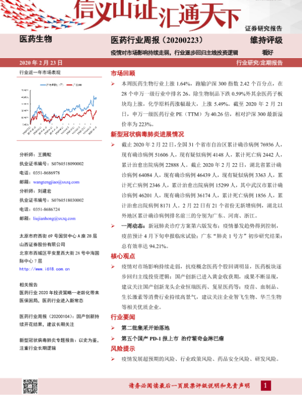 【山西证券】【20200223】医药行业周报:疫情对市场影响持续走弱,行业逐步回归主线投资逻辑-11页