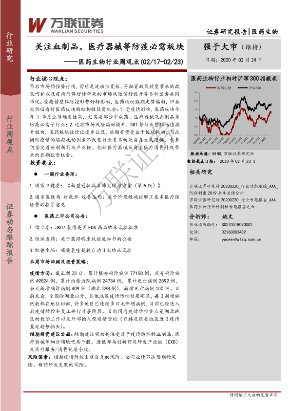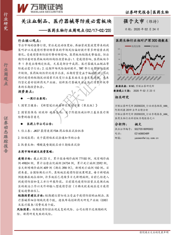 【万联证券】【20200224】医药生物行业周观点:关注血制品、医疗器械等防疫必需板块-7页