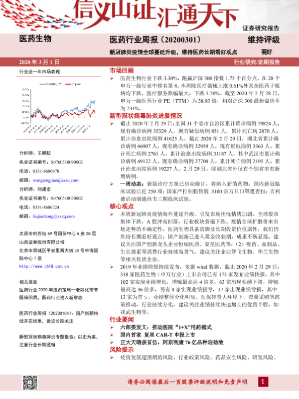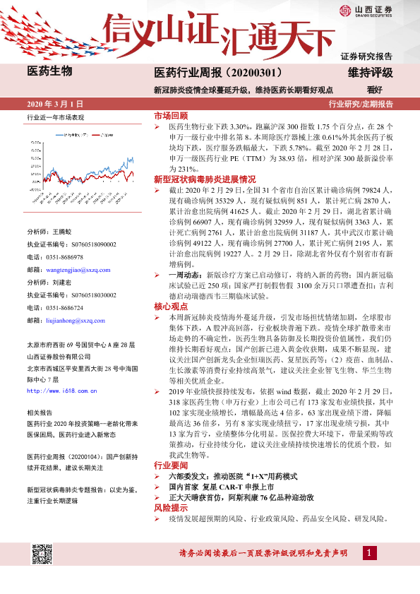 【山西证券】【20200301】医药行业周报:新冠肺炎疫情全球蔓延升级,维持医药长期看好观点-10页