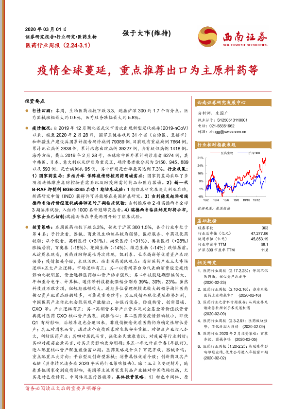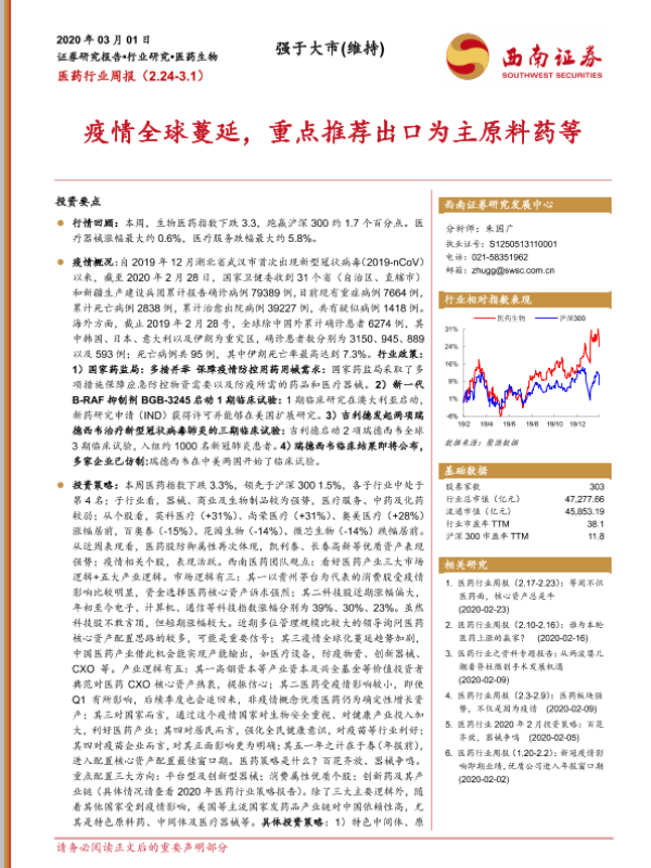 【西南证券】【20200301】医药行业周报:疫情全球蔓延,重点推荐出口为主原料药等-19页