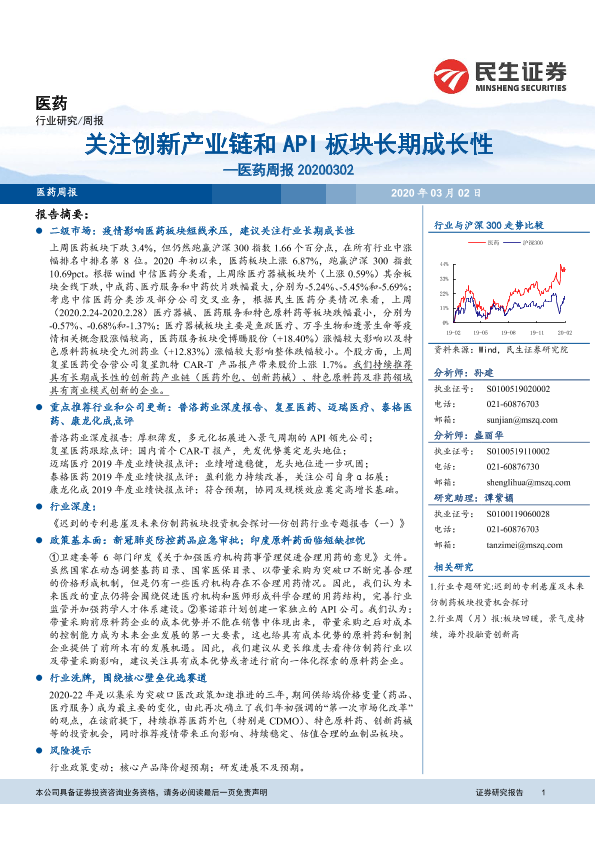 【民生证券】【20200302】关注创新产业链和API板块长期成长性-18页