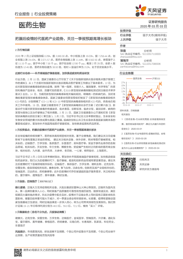 【天风证券】【20200303】医药生物行业投资策略:把握后疫情时代医药产业趋势,关注一季报预期高增长板块-17页