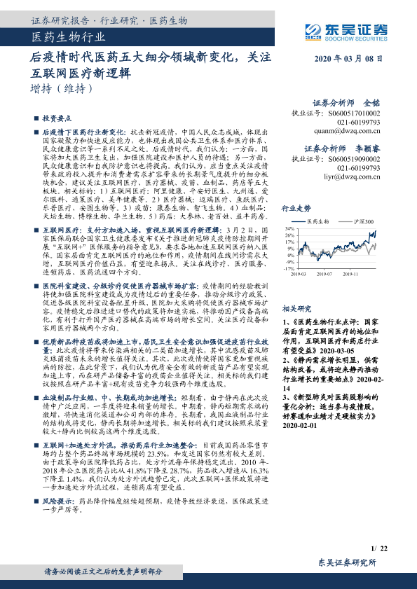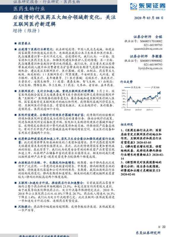 【东吴证券】【20200308】后疫情时代医药五大细分领域新变化,关注互联网医疗新逻辑-22页