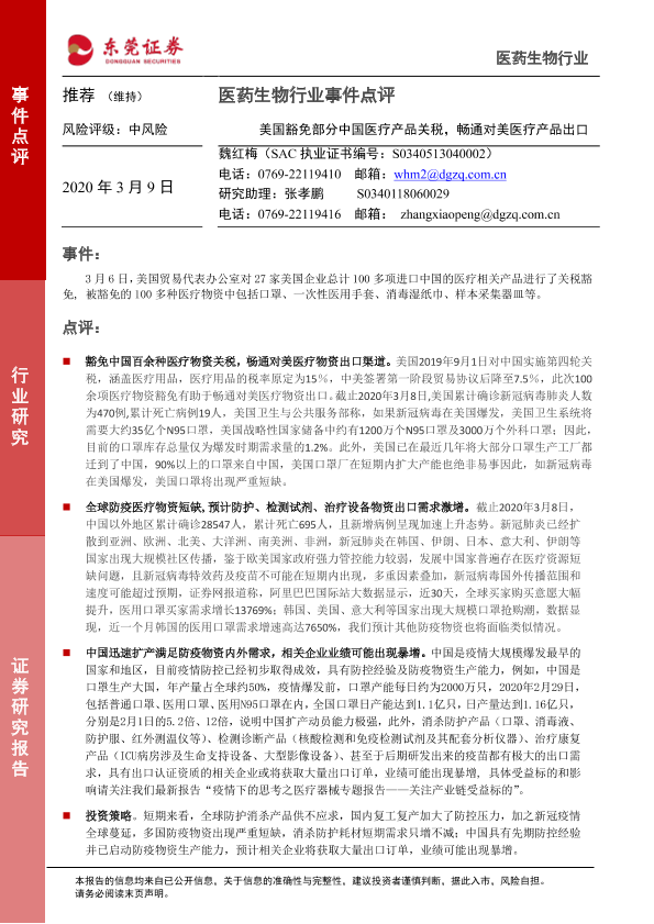 【东莞证券】【20200309】美国豁免部分中国医疗产品关税,畅通对美医疗产品出口-3页