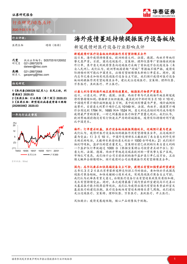 【华泰证券】【20200311】新冠疫情对医疗设备行业影响点评:海外疫情蔓延持续提振医疗设备板块-2页