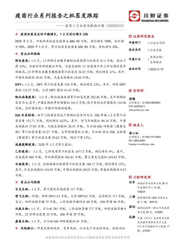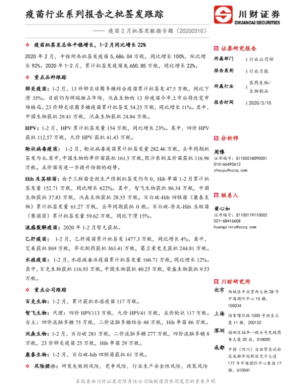 【川财证券】【20200310】疫苗2月批签发数据专题:疫苗行业系列报告之批签发跟踪-15页