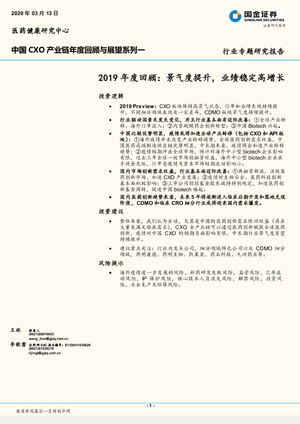 【国金证券】【20200313】中国CXO产业链年度回顾与展望系列一:2019年度回顾:景气度提升,业绩稳定高增长-15页