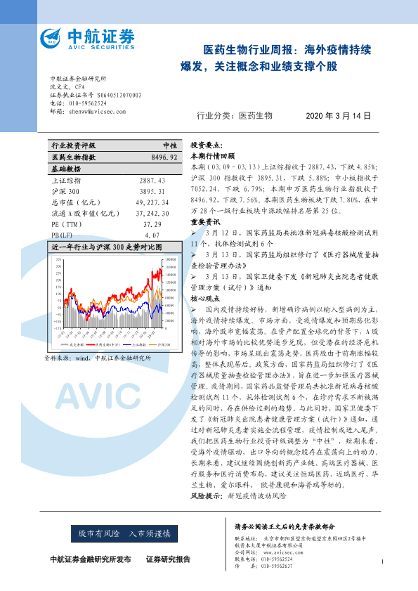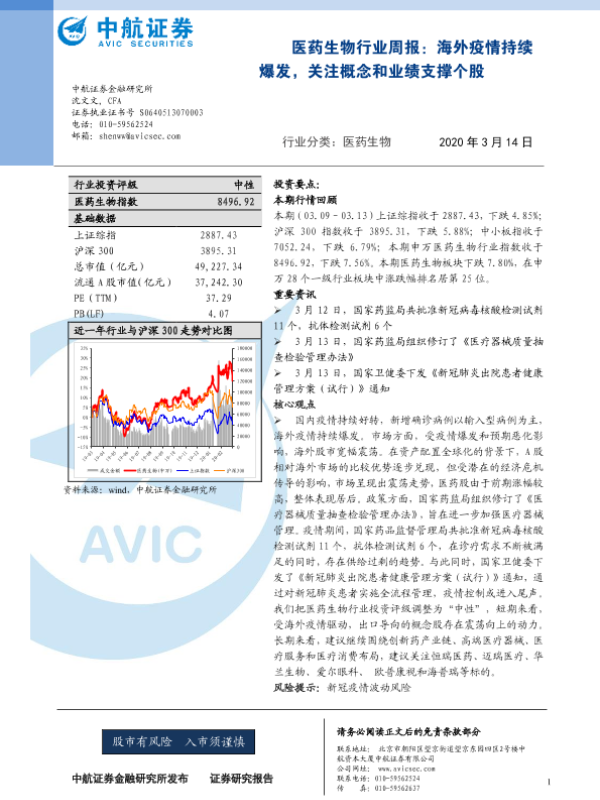 【中航证券】【20200314】医药生物行业周报:海外疫情持续爆发,关注概念和业绩支撑个股-6页