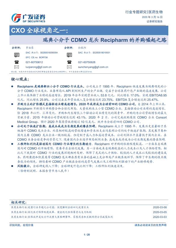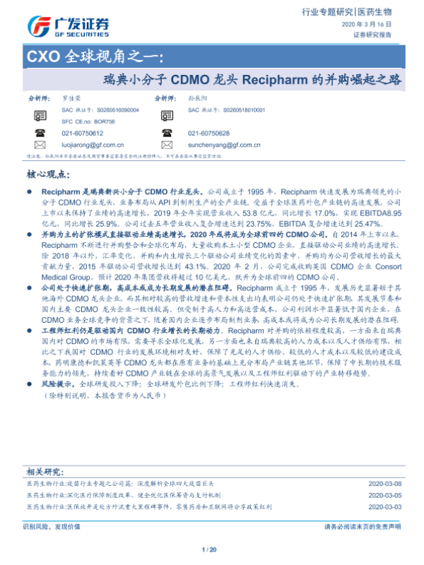 【广发证券】【20200316】CXO全球视角之一:瑞典小分子CDMO龙头Recipharm的并购崛起之路-20页