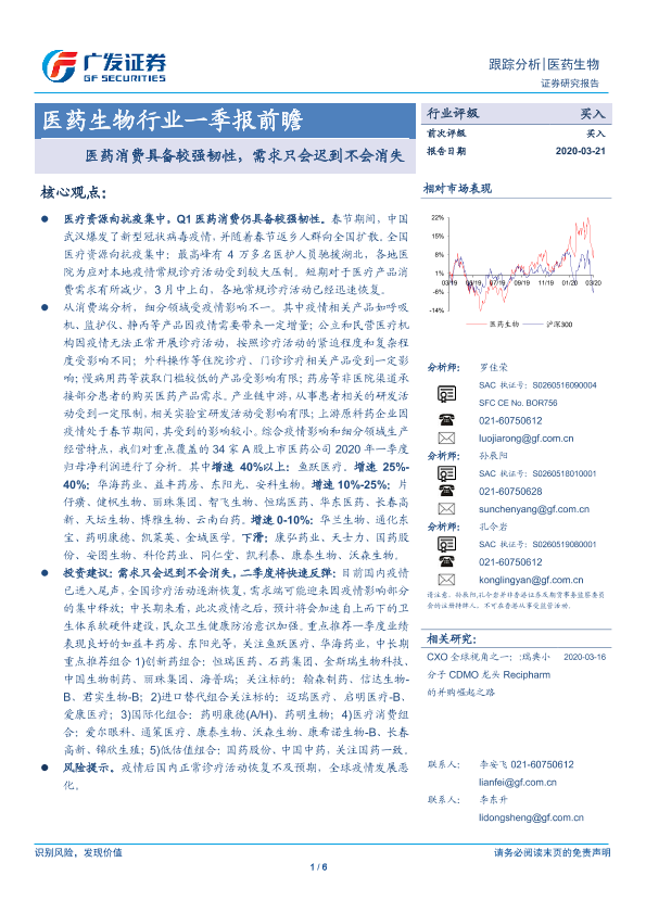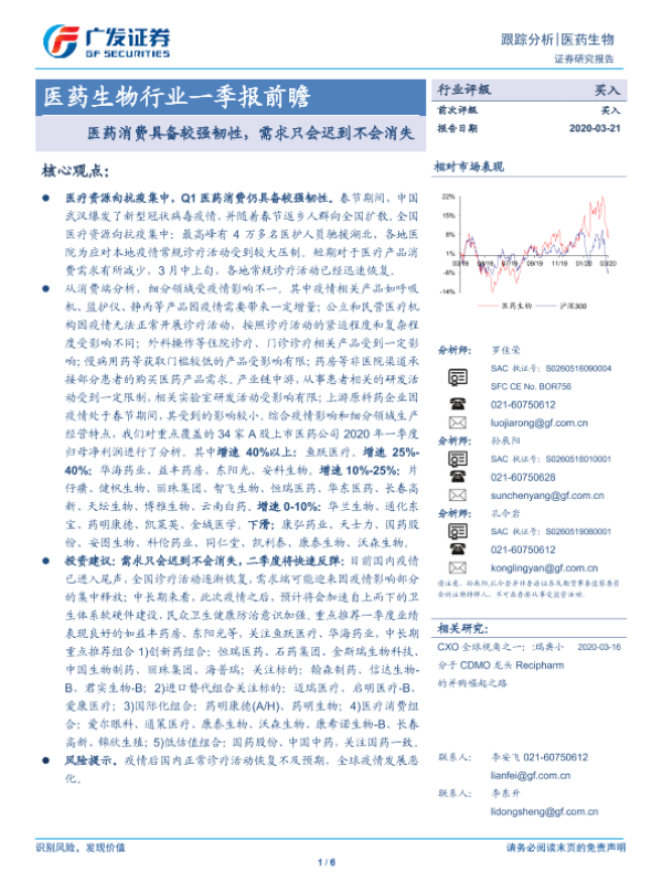 【广发证券】【20200321】医药生物行业一季报前瞻:医药消费具备较强韧性,需求只会迟到不会消失-6页