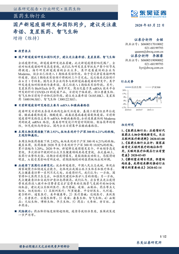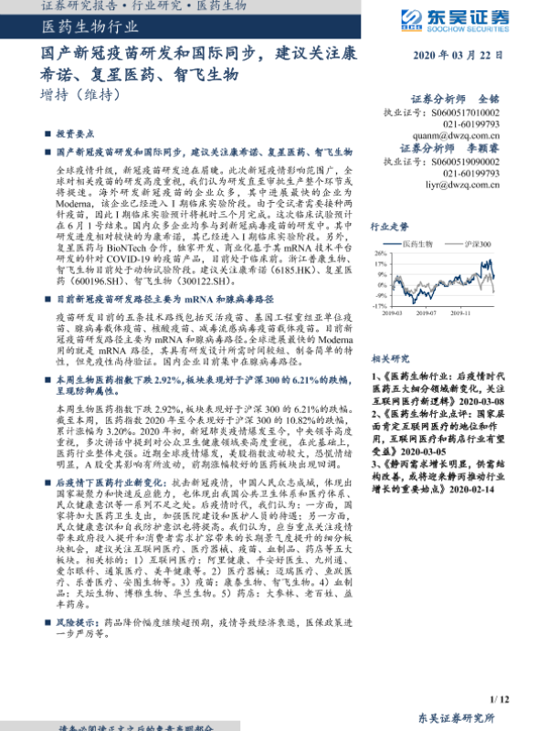 【东吴证券】【20200322】国产新冠疫苗研发和国际同步,建议关注康希诺、复星医药、智飞生物-12页