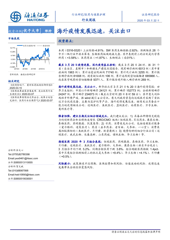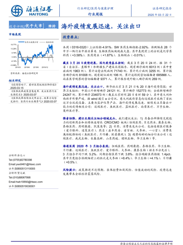 【海通证券】【20200322】医药与健康护理行业周报:海外疫情发展迅速,关注出口-5页