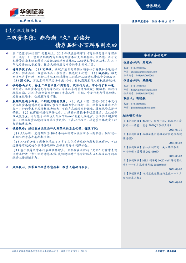 【华创证券】【20210813】债券品种小百科系列之四:二级资本债,渐行渐“久”的偏好-21页