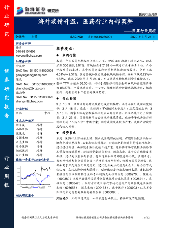 【渤海证券】【20200325】医药行业周报:海外疫情升温,医药行业内部调整-12页