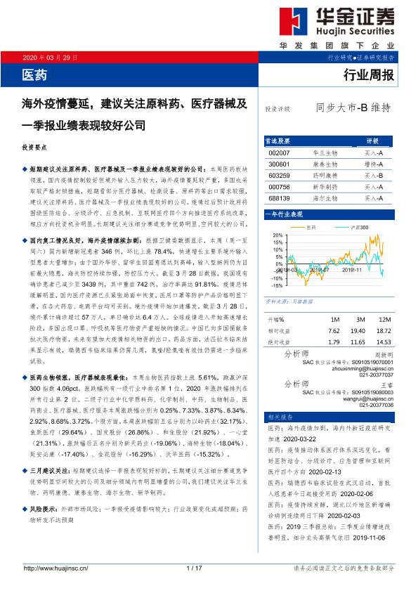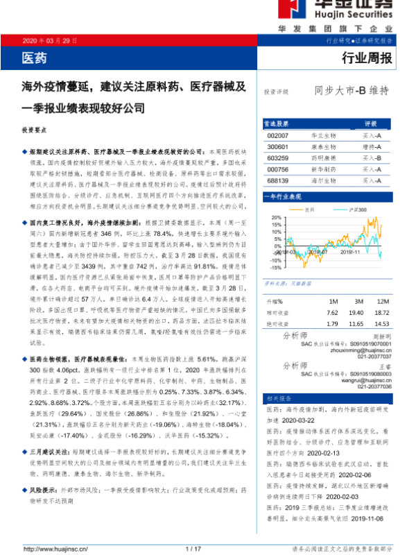 【华金证券】【20200329】医药行业周报:海外疫情蔓延,建议关注原料药、医疗器械及一季报业绩表现较好公司-17页