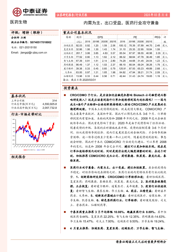 【中泰证券】【20200331】医药生物行业月报:内需为主、出口受益,医药行业攻守兼备-14页