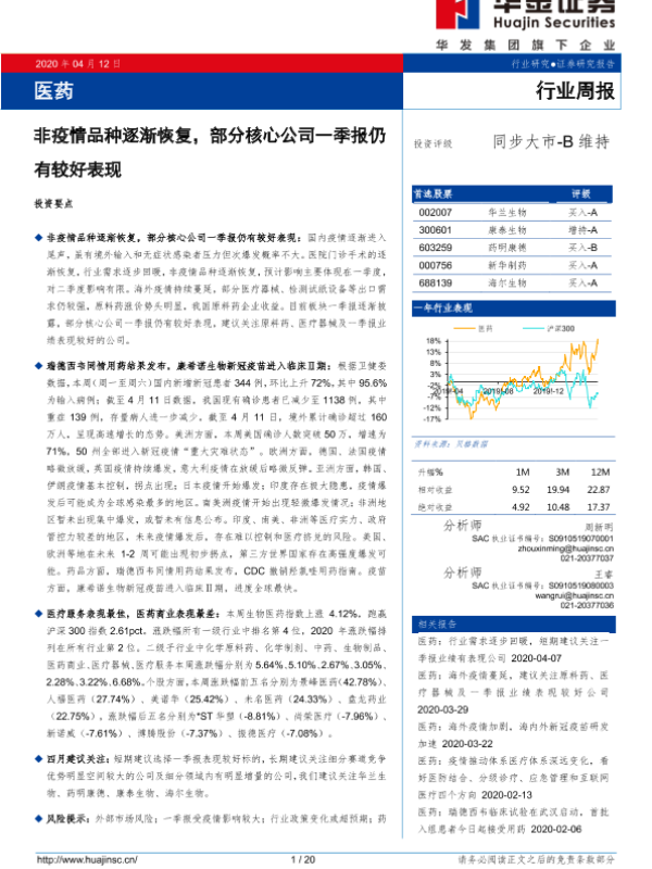 【华金证券】【20200412】医药行业周报:非疫情品种逐渐恢复,部分核心公司一季报仍有较好表现-20页