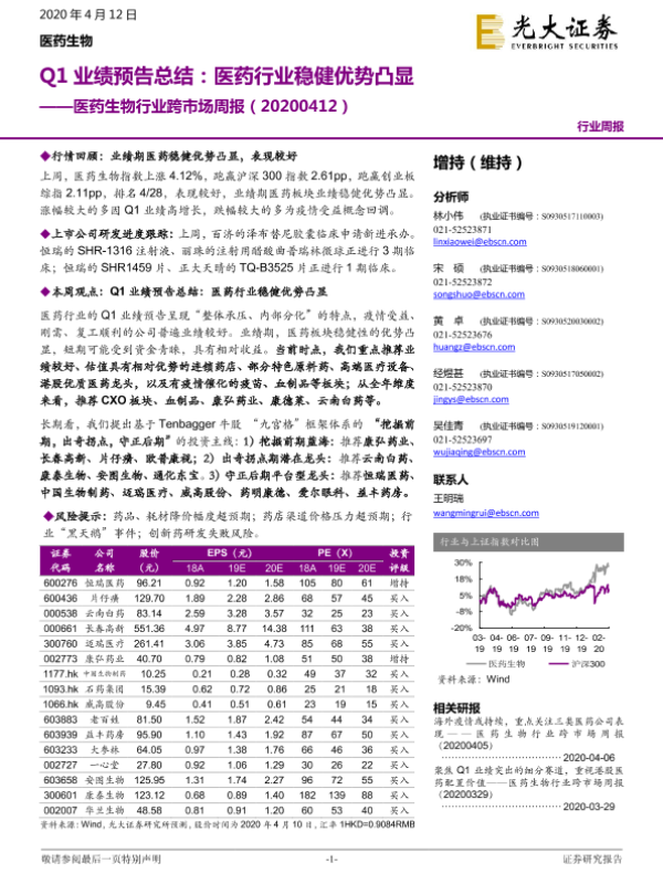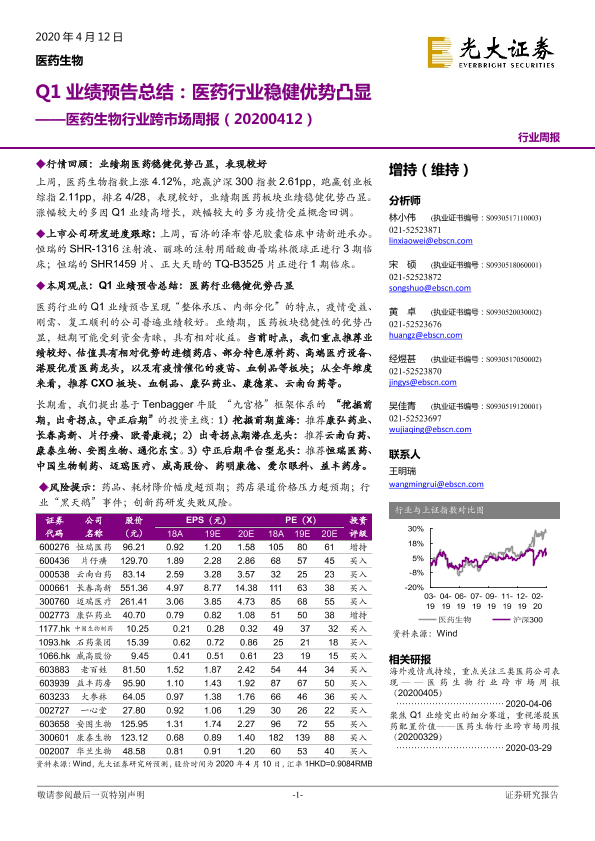 【光大证券】【20200412】医药生物行业跨市场周报:Q1业绩预告总结-36页