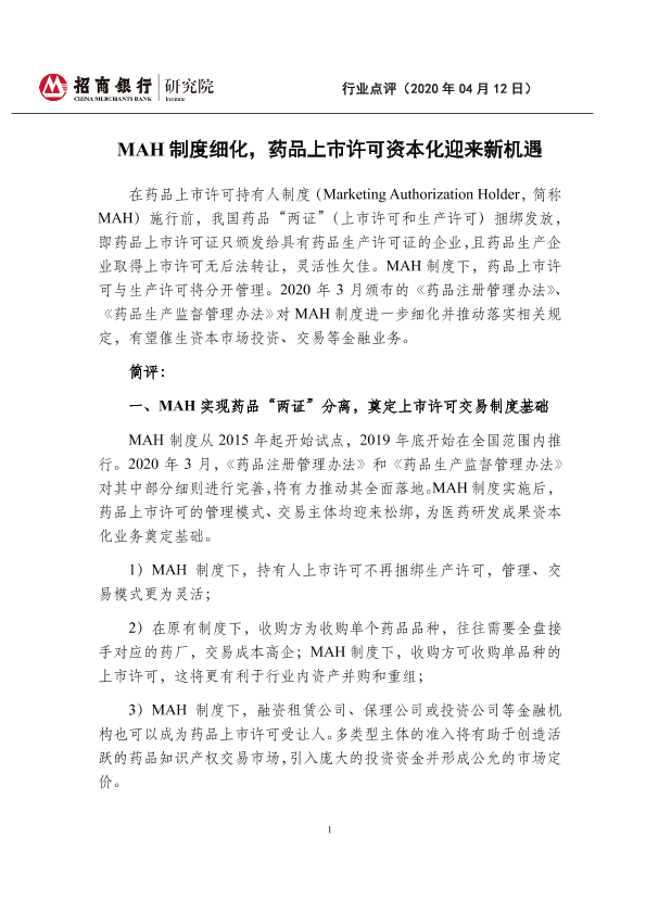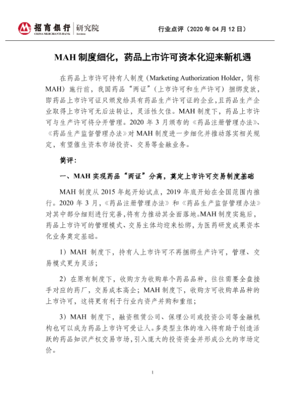 【招商银行】【20200412】医药行业:MAH制度细化,药品上市许可资本化迎来新机遇-5页