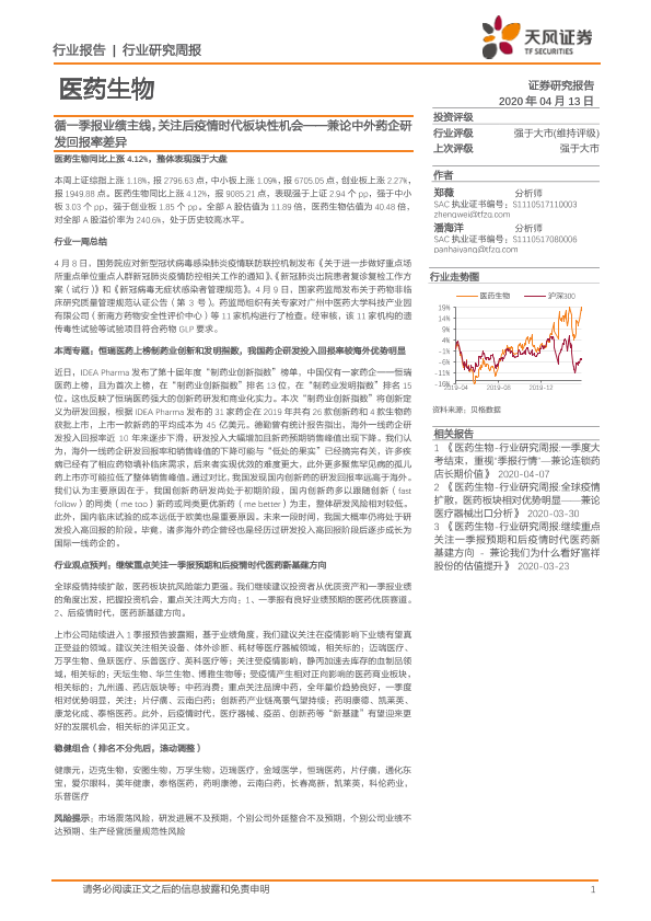 【天风证券】【20200413】医药生物行业研究周报:循一季报业绩主线,关注后疫情时代板块性机会——兼论中外药企研发回报率差异-22页