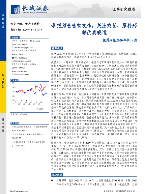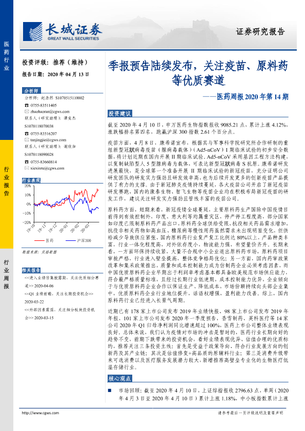 【长城证券】【20200413】医药周报2020年第14期:季报预告陆续发布,关注疫苗、原料药等优质赛道-19页